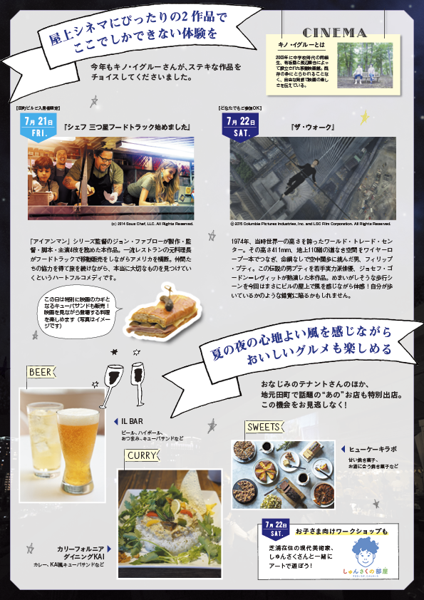 当日は移動映画館キノ・イグルーがセレクトした映画『シェフ3つ星トラック始めました』、『ザ・ウォーク』を上映します。